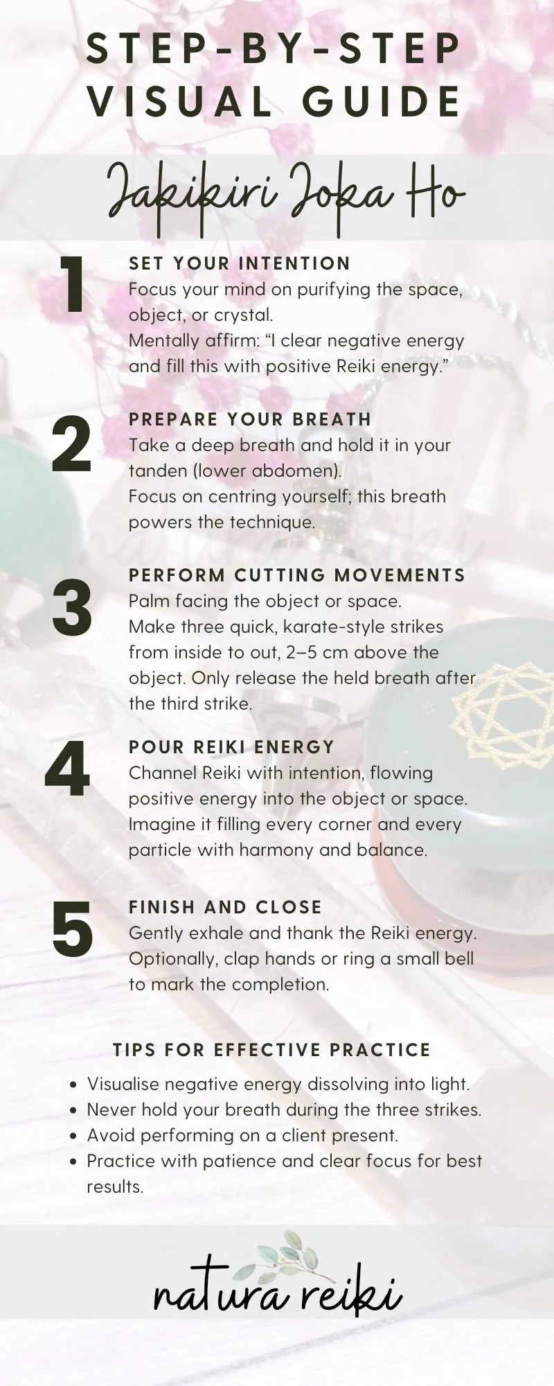 In short, Jakikiri Joka Ho is not just a ritual; it’s a powerful way to prepare your practice and tools so that energy flows freely and clearly. Integrating this technique allows every Reiki session to become a purer, more conscious, and deeply harmonious experience.